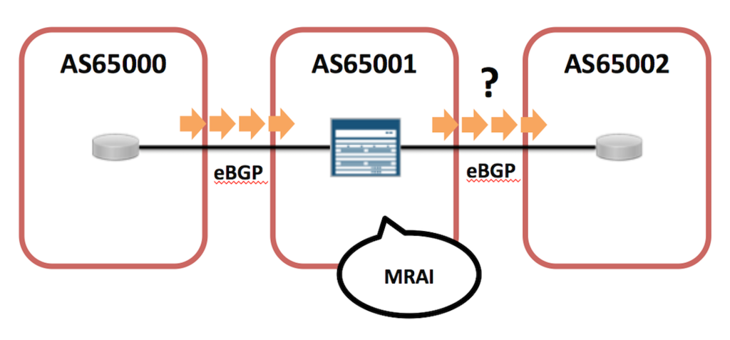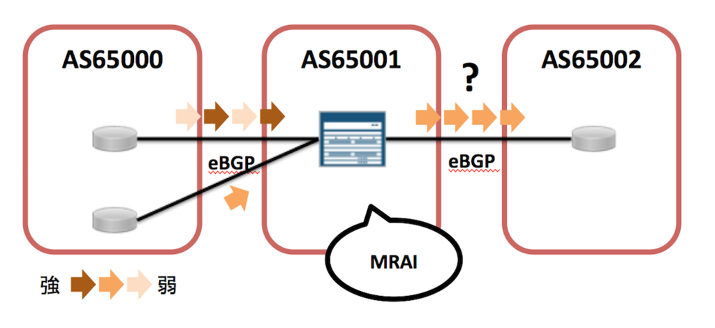おおまかには,MRAI は経路計算結果をバッファしておいて 一定時間待ってフラッシュするしくみと捉えておけばいいと思う.同じprefix について何度も経路計算したとしてもフラッシュ時には1 Update になるため,結果的にBGP Update の数を抑えることができる.