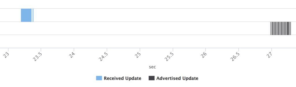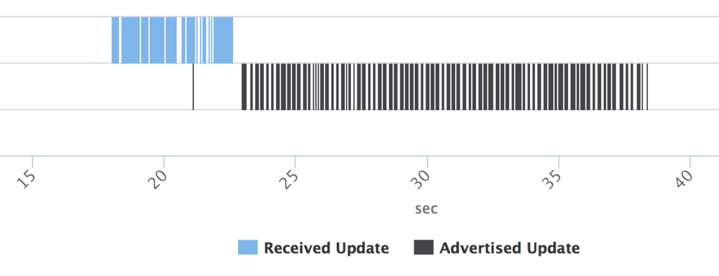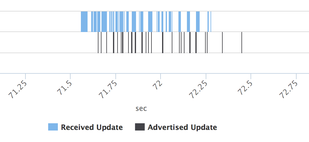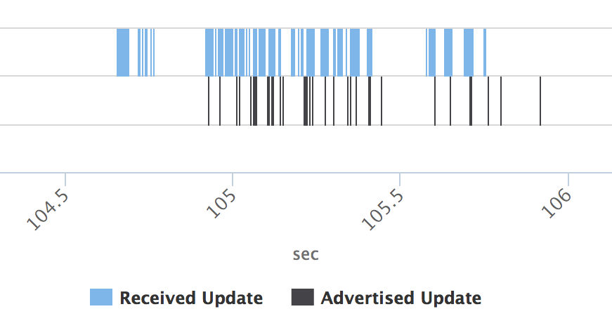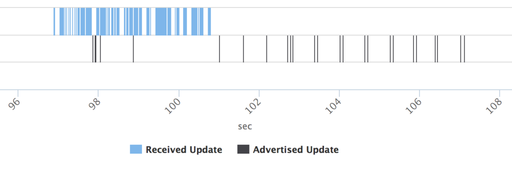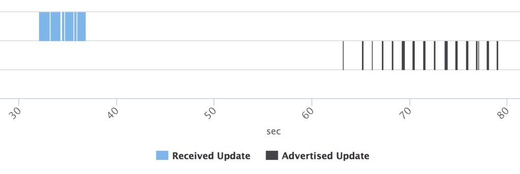 Interval を待たず 何か一部お漏らししているように見えるが,(青い四角の下の黒い線) たぶん30s 待ちたいんだろうなあと汲み取った.Interval なくUpdate を送ってしまっているのは,全体300 packet 中の20 packet.
