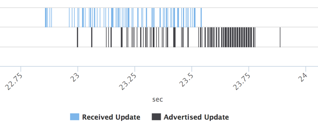 (60s すぎのBGP Update 受信(青) と送信(オレンジ) が重複している部分,送信のほうが若干早い)