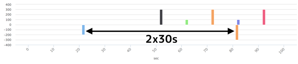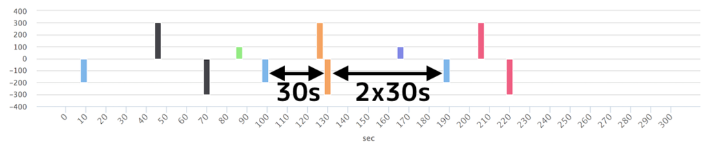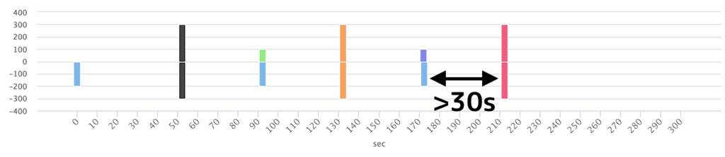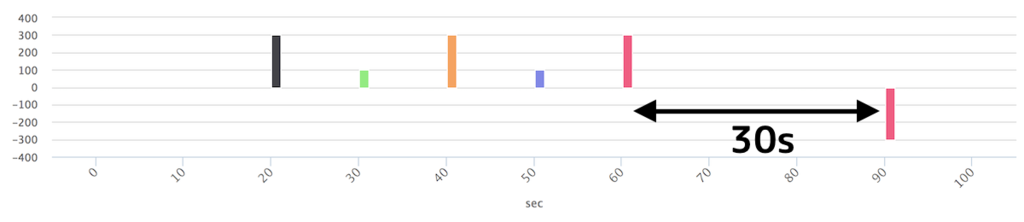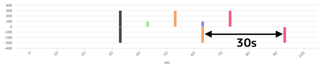 グラフのスケールが違ってて申し訳ないが,経路処理の遅延に加えて30s のInterval をおいていることがわかる.
